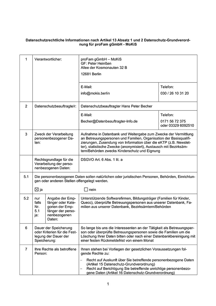 Datenschutzrechtliche Informationen nach Artikel 13 Absatz 1 und 2 Datenschutz-Grundverordnung für proFam gGmbH - MoKiS